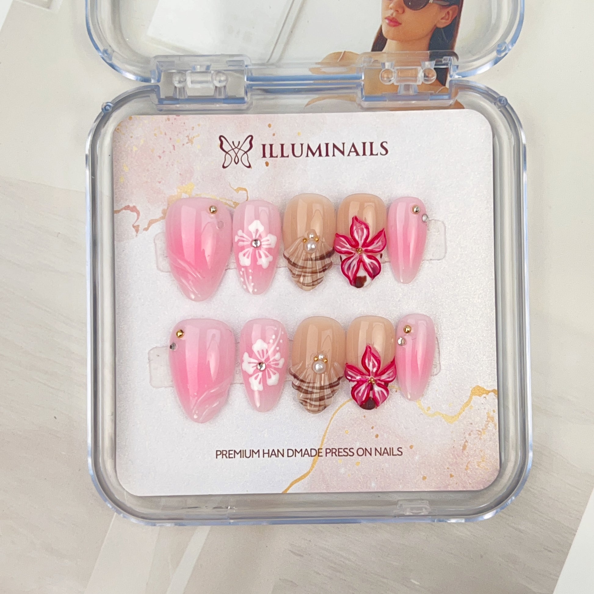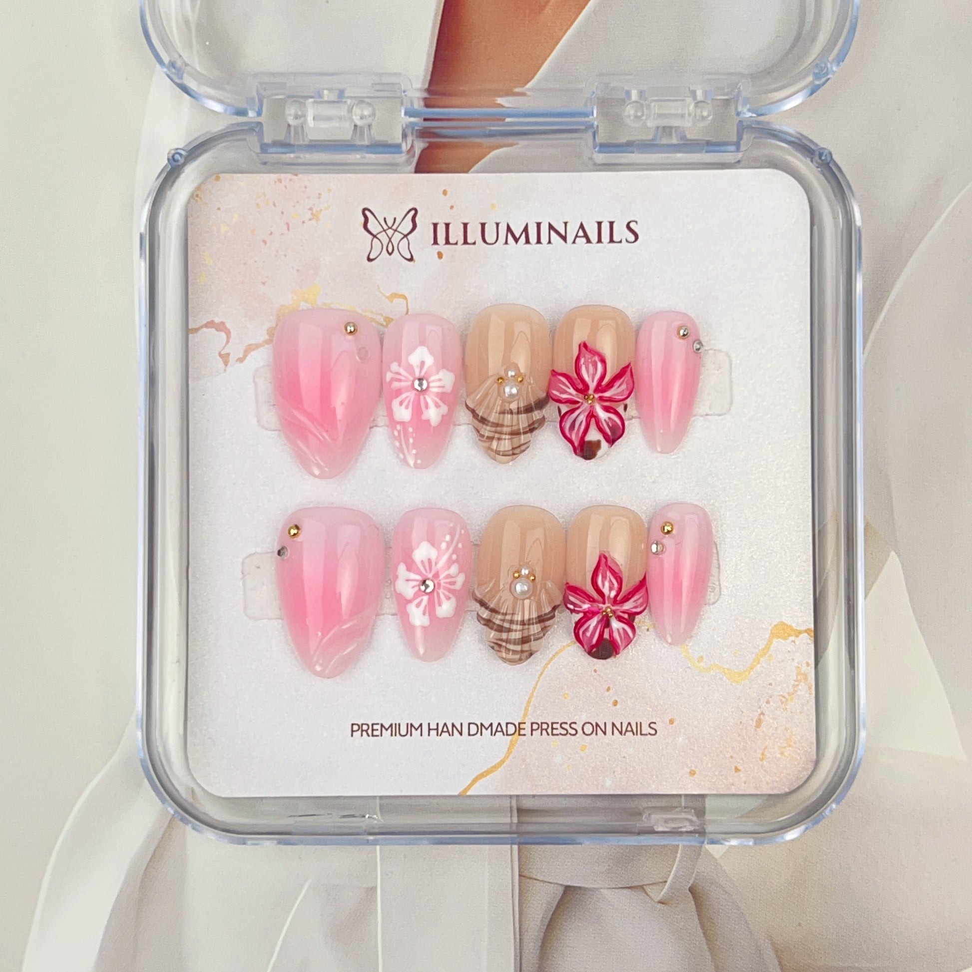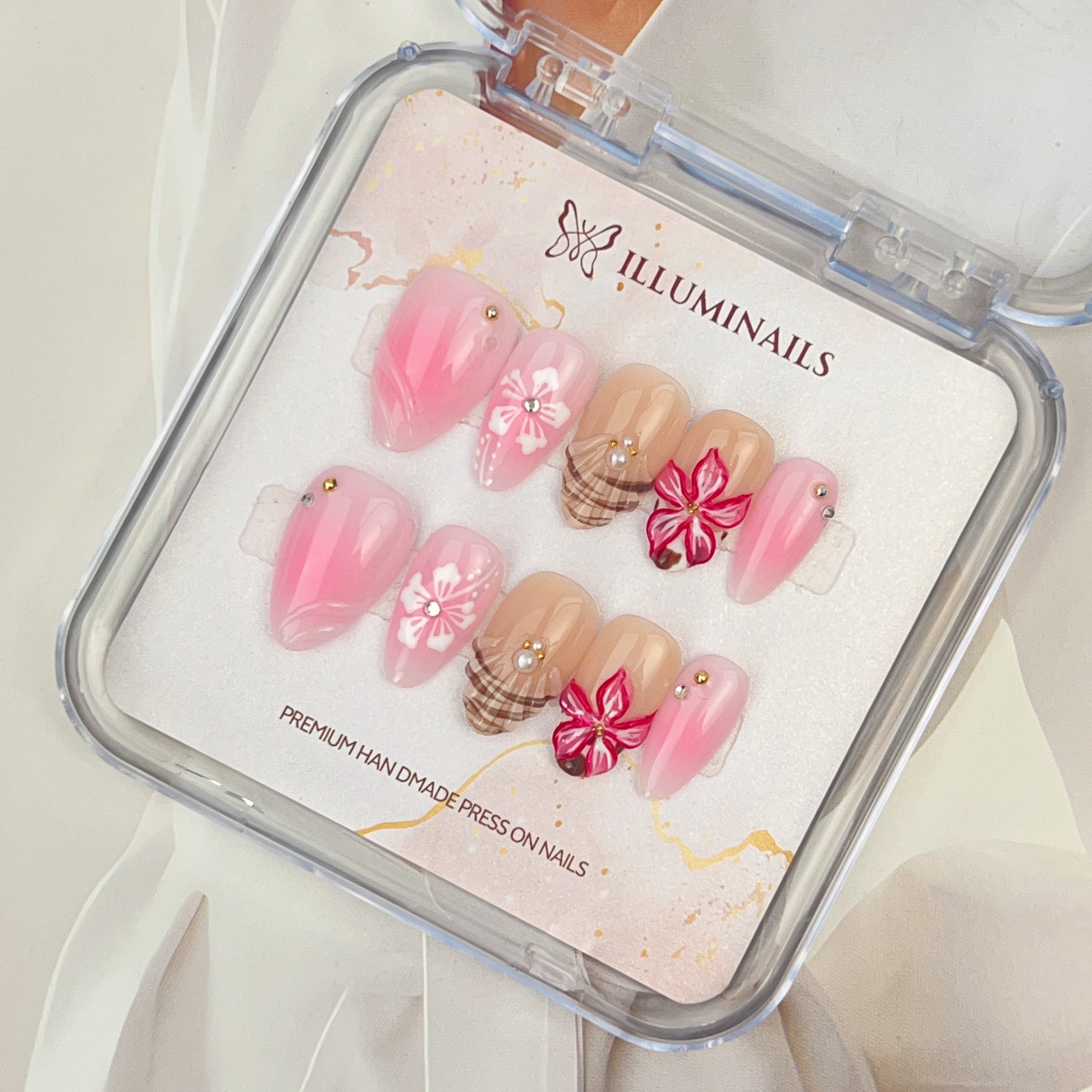 Blossom Picnic captures the soft charm of a spring afternoon spent outdoors. A gentle pink ombré base blends seamlessly with warm nude tones, layered with hand-painted floral details that feel fresh, playful, and feminine.