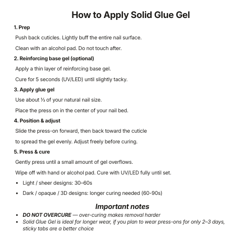 - Solid Glue Gel (30ml) A thick, clear solid adhesive that cures under UV light for a super strong bond.Best for light-colored or semi-transparent press-ons. Long-wear, clean finish.