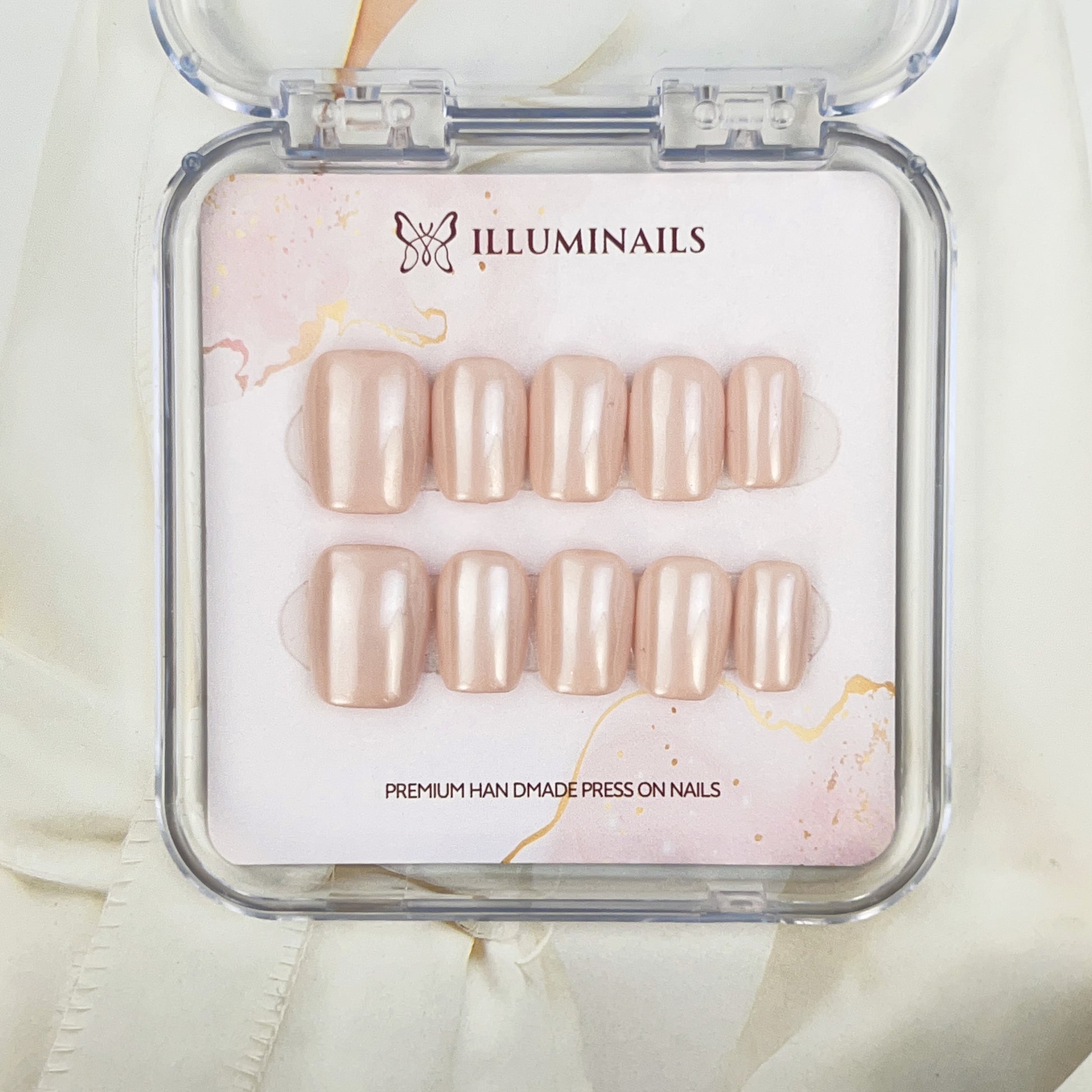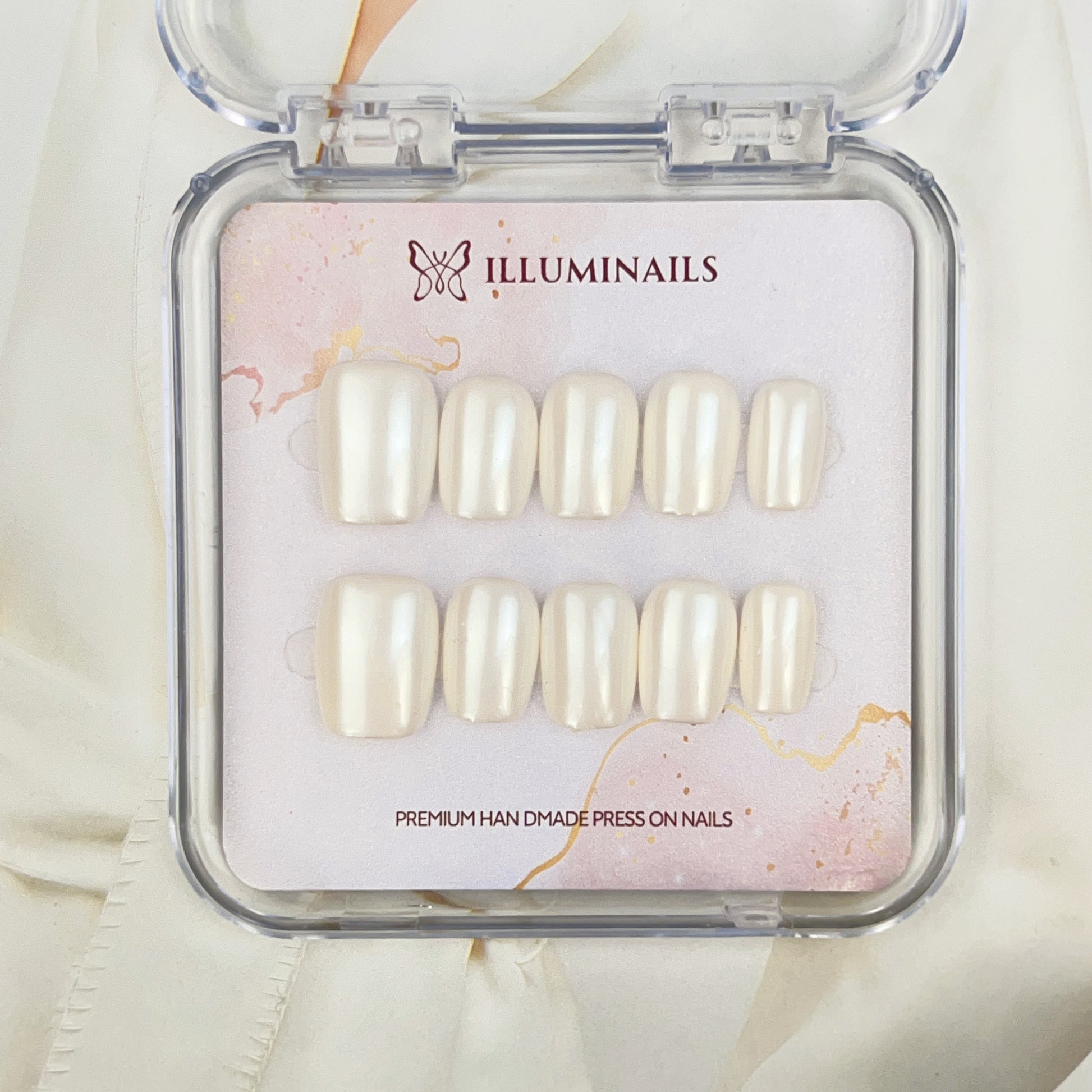 Glazed Essentials is a curated glazed donut press-on nail set featuring soft pearl tones and a luminous, glass-like finish.