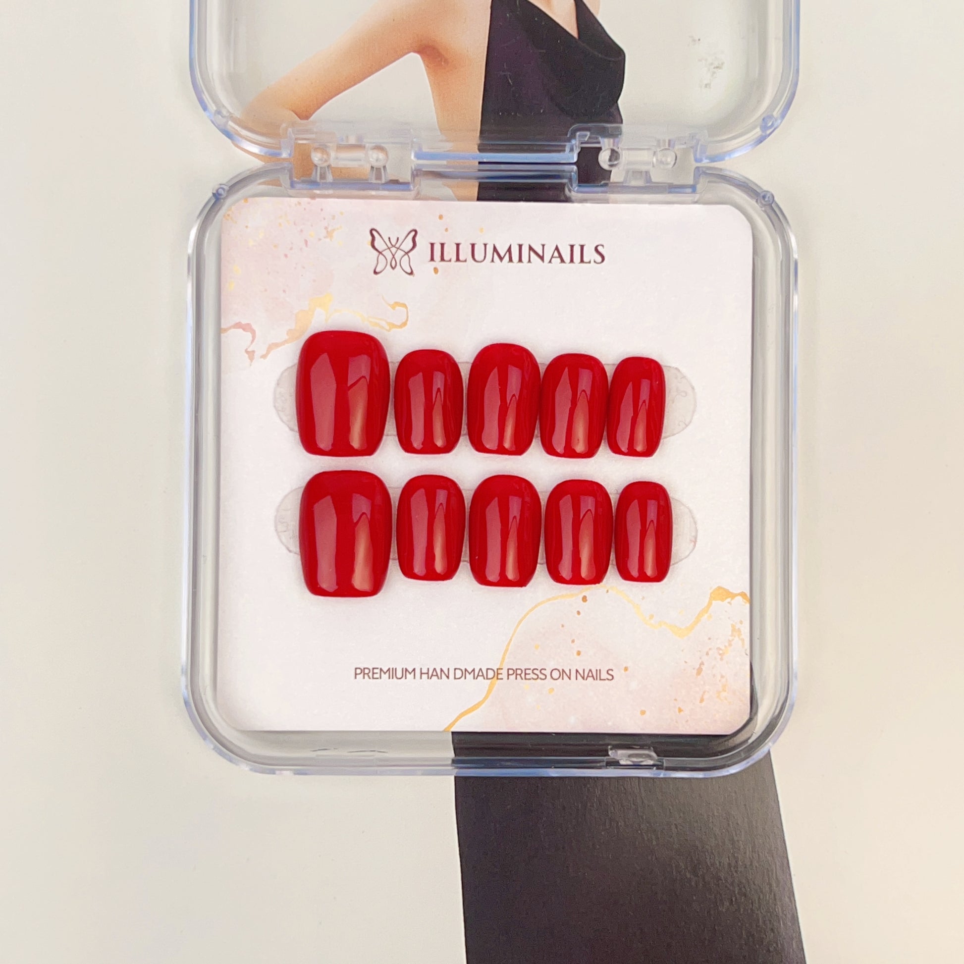 Crimson Kiss is a solid-color press-on nail collection designed for effortless everyday wear.