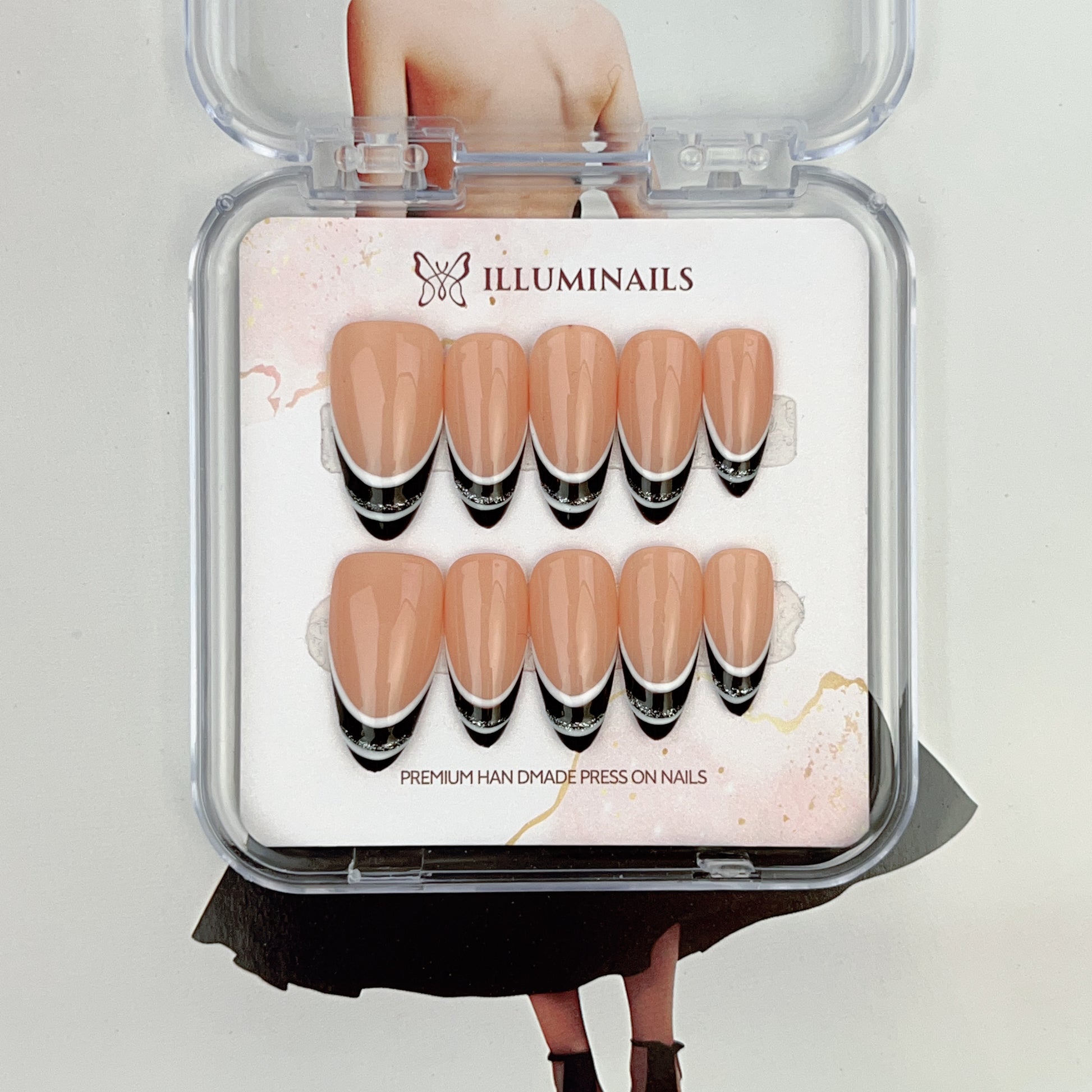 Modern Edge is a refined press-on nail set defined by clean lines and confident contrast. A soft nude base is paired with sharp black French tips, finished with a subtle silver accent that adds just the right amount of edge without overpowering the look.