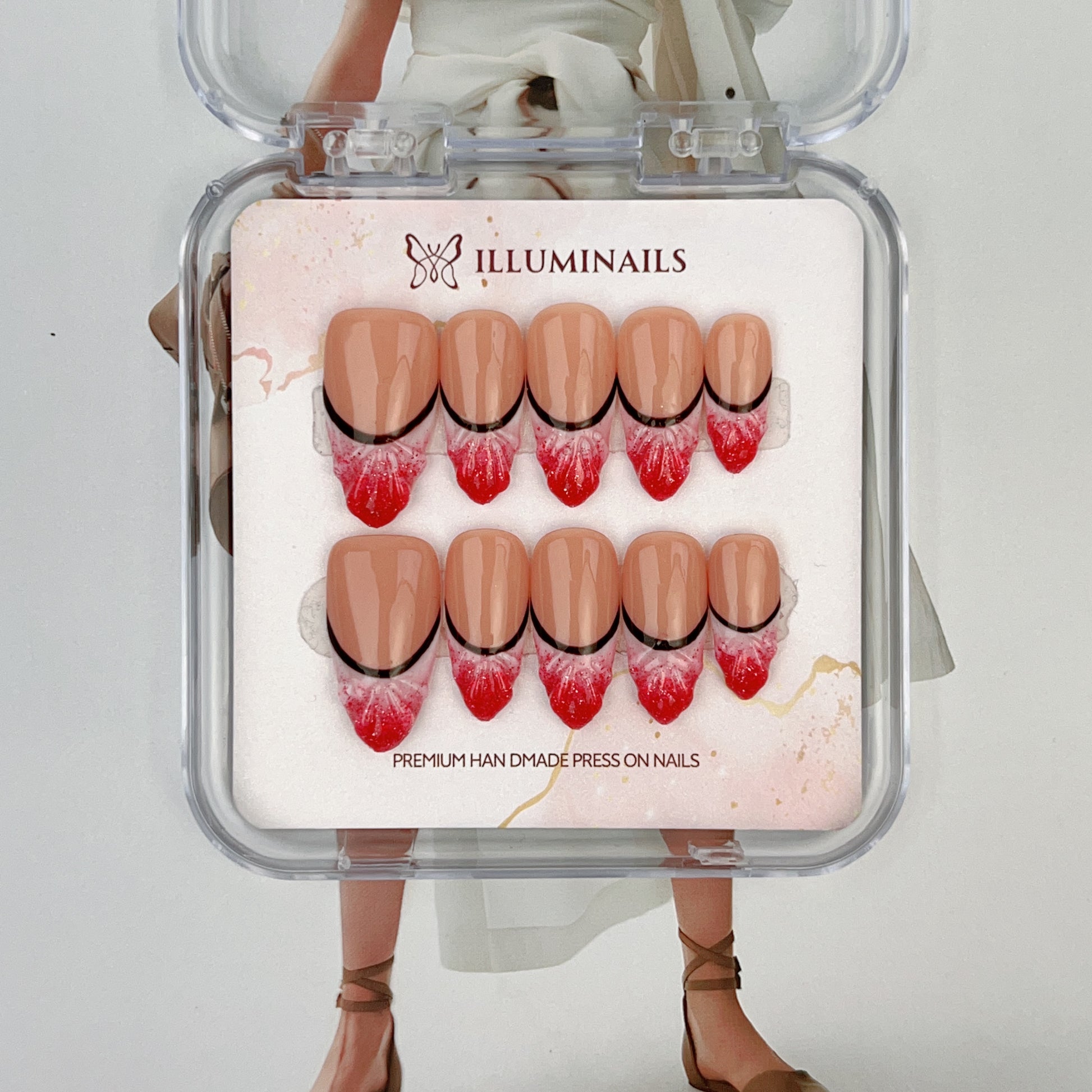 - Soft nude base with blush-red gradient tips