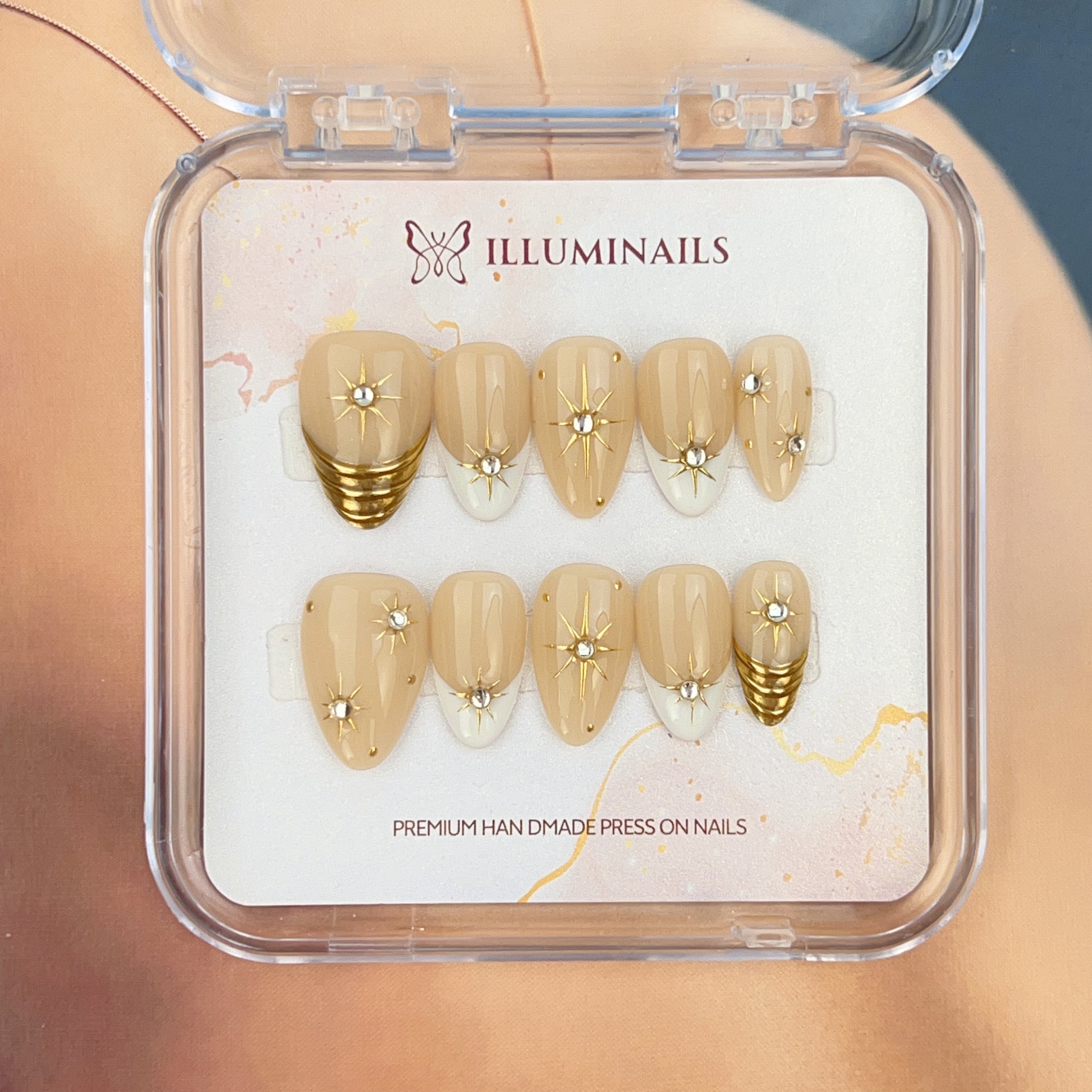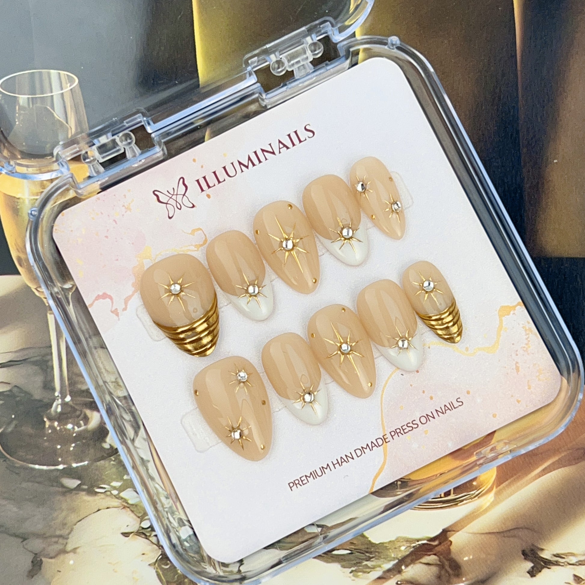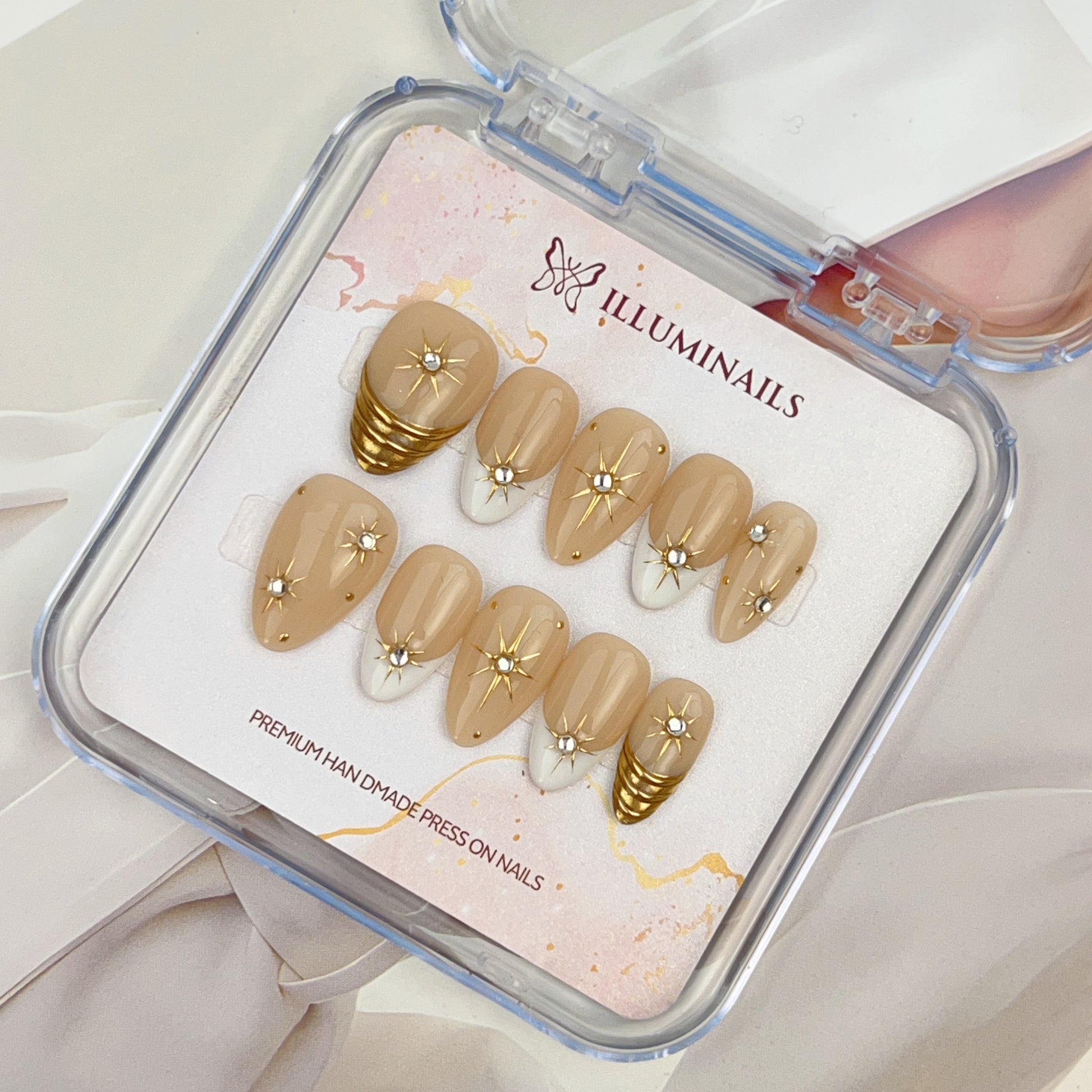 A refined nude-toned press-on nail set designed for understated elegance. Soft beige bases are paired with subtle ivory accents, finished with delicate gold details and crystal star motifs. The overall look is clean, balanced, and thoughtfully composed, making it suitable for both everyday wear and more polished occasions.