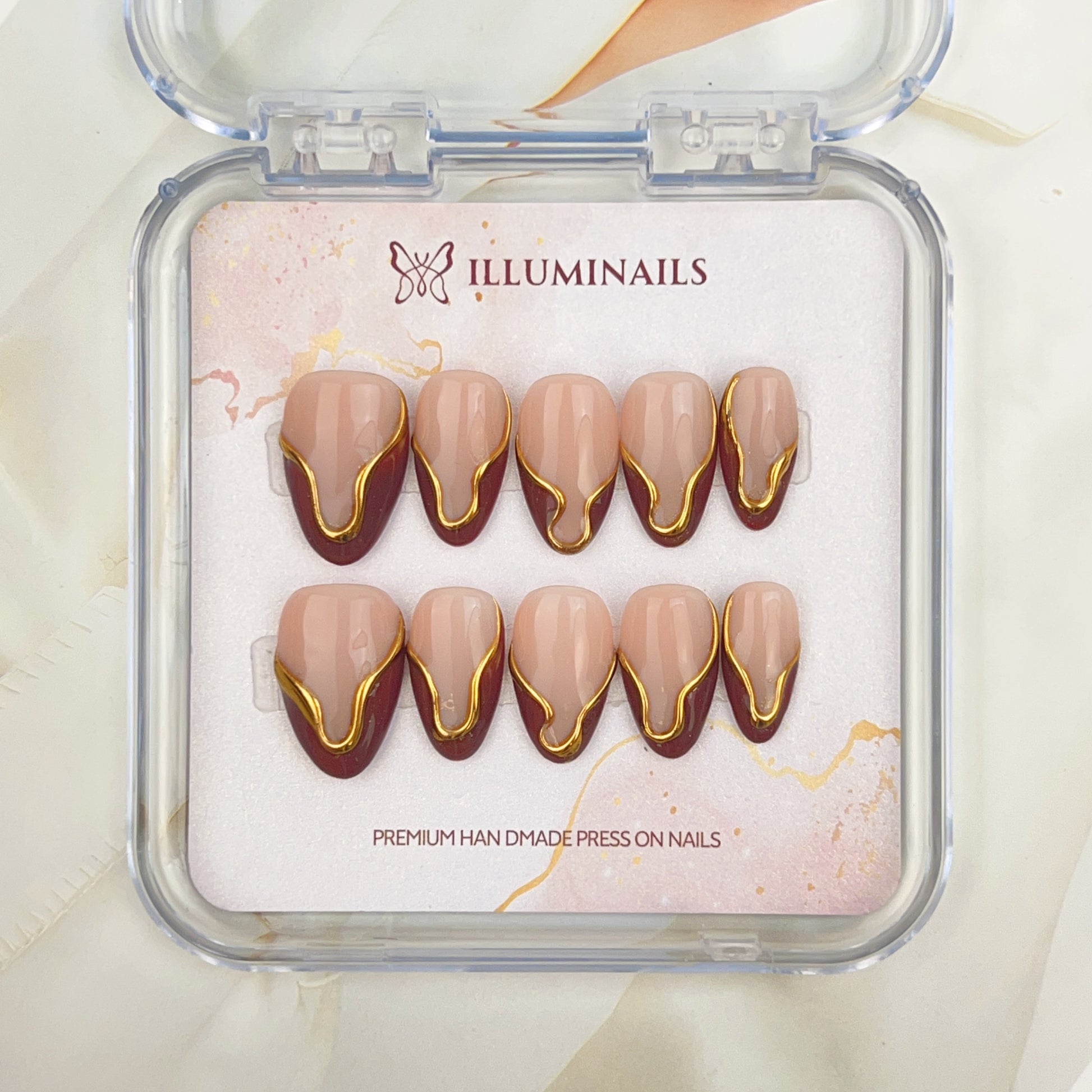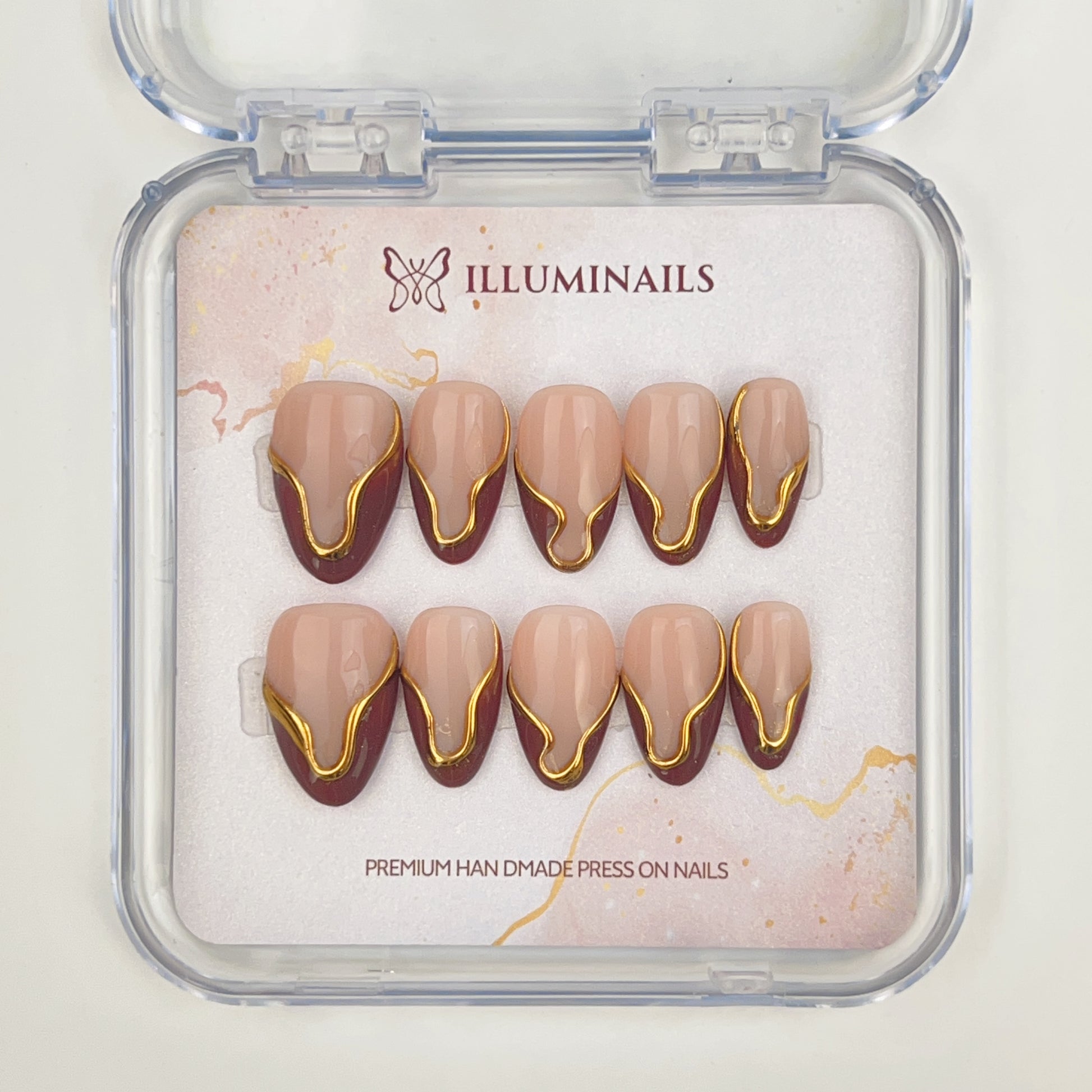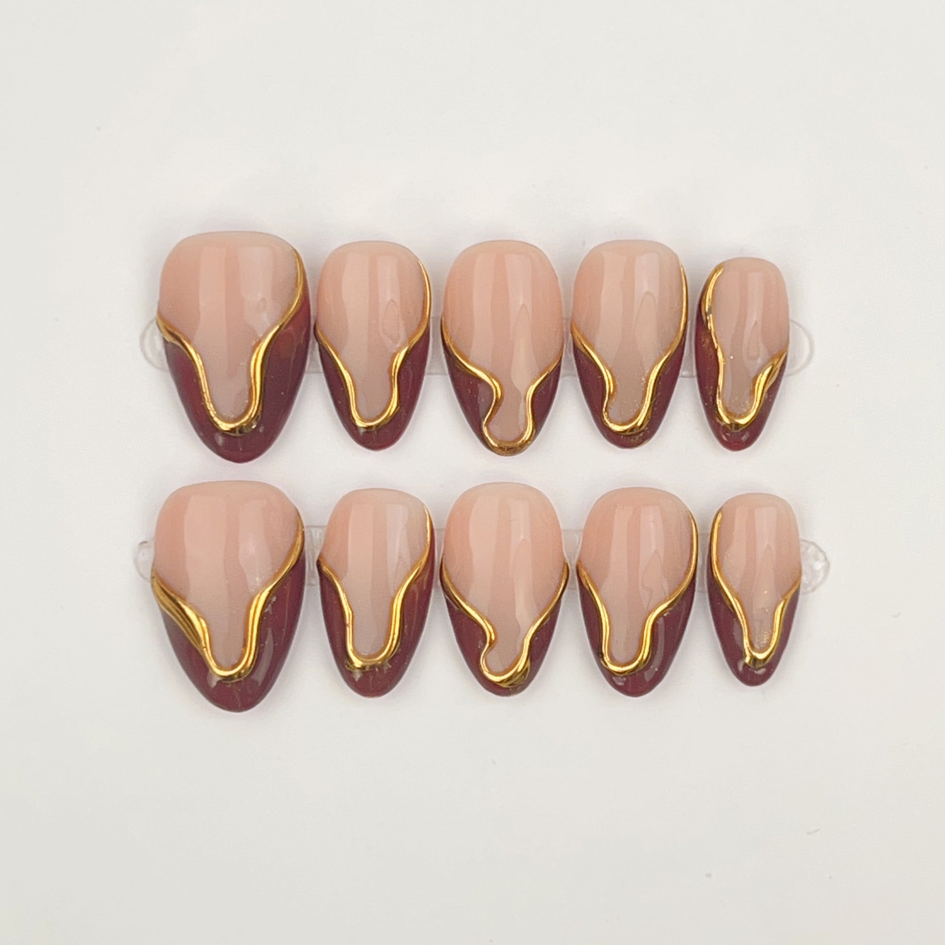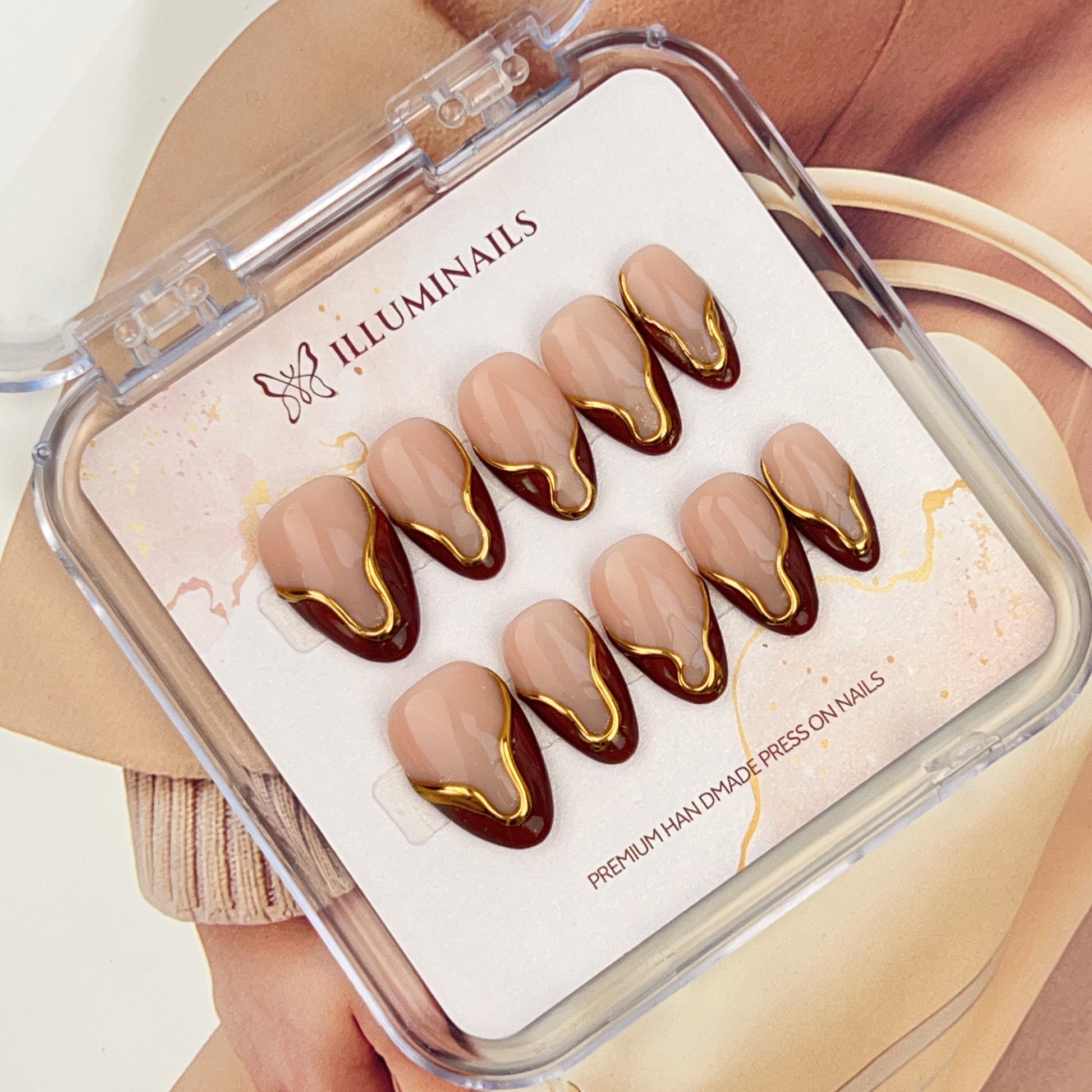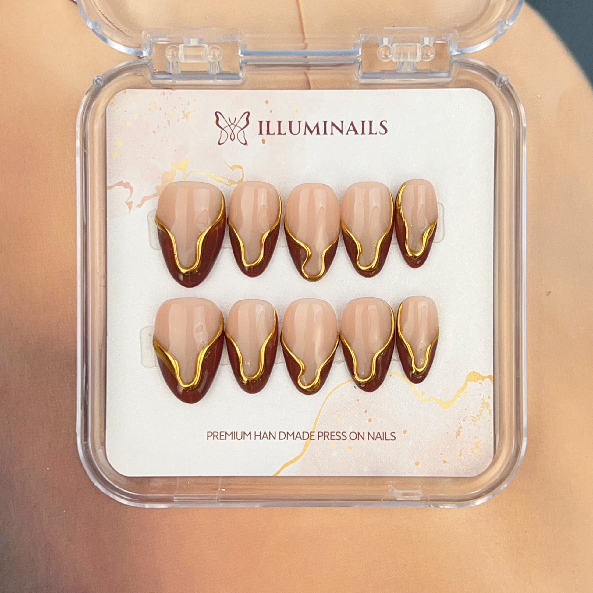 Golden Mocha is a warm, refined press-on nail set that blends soft nude tones with deep mocha accents. Fluid gold detailing traces the contours of each nail, creating a subtle contrast that feels modern, sculptural, and intentional. The overall look is polished without being overpowering, striking a balance between elegance and quiet confidence.