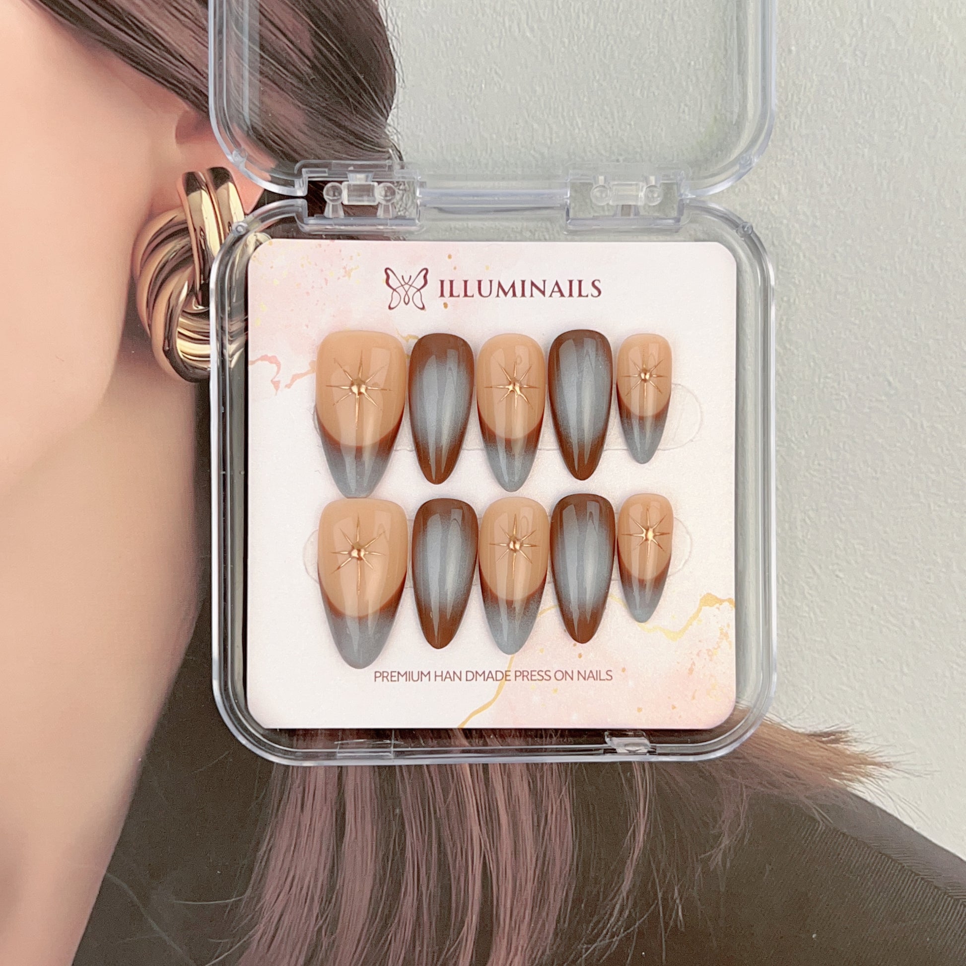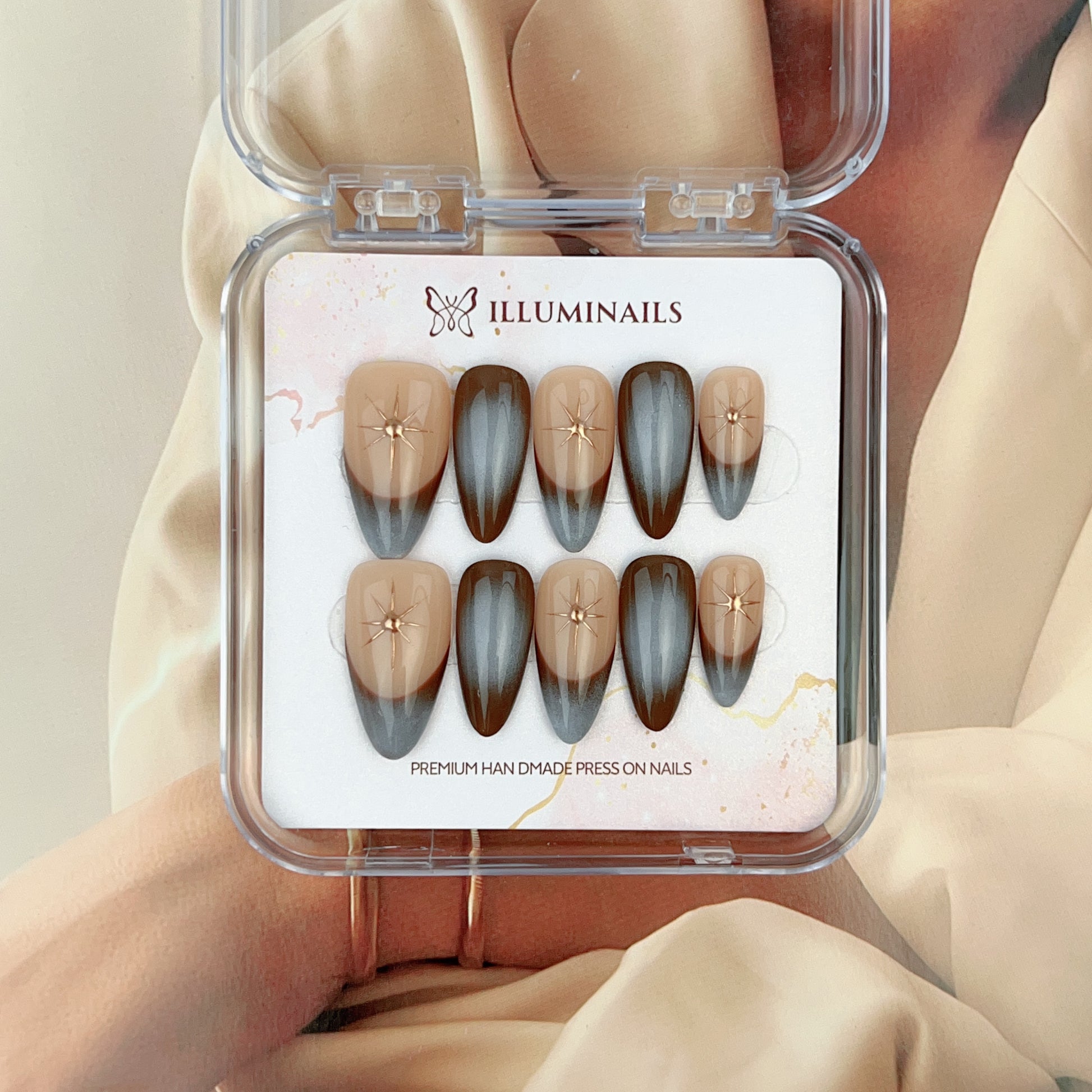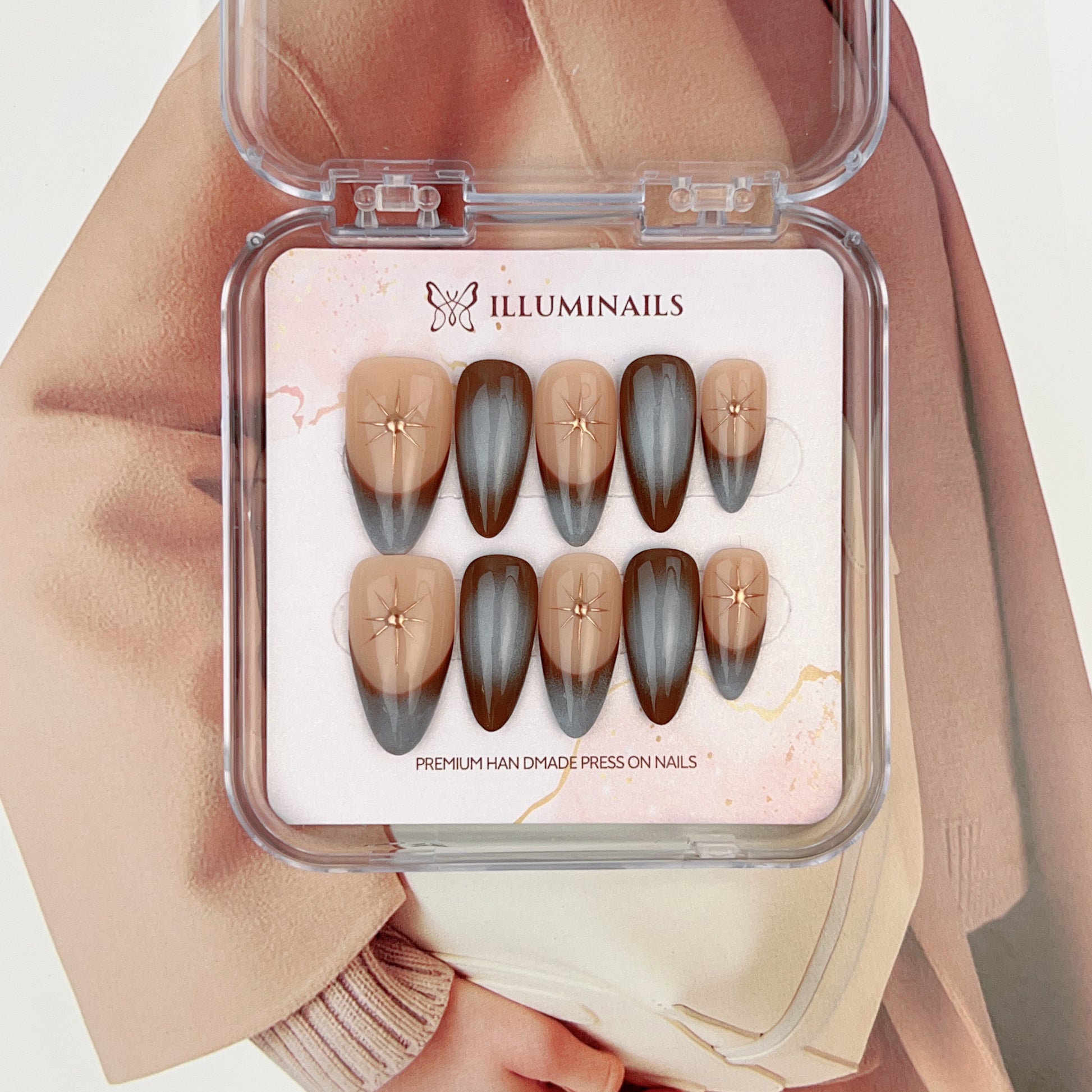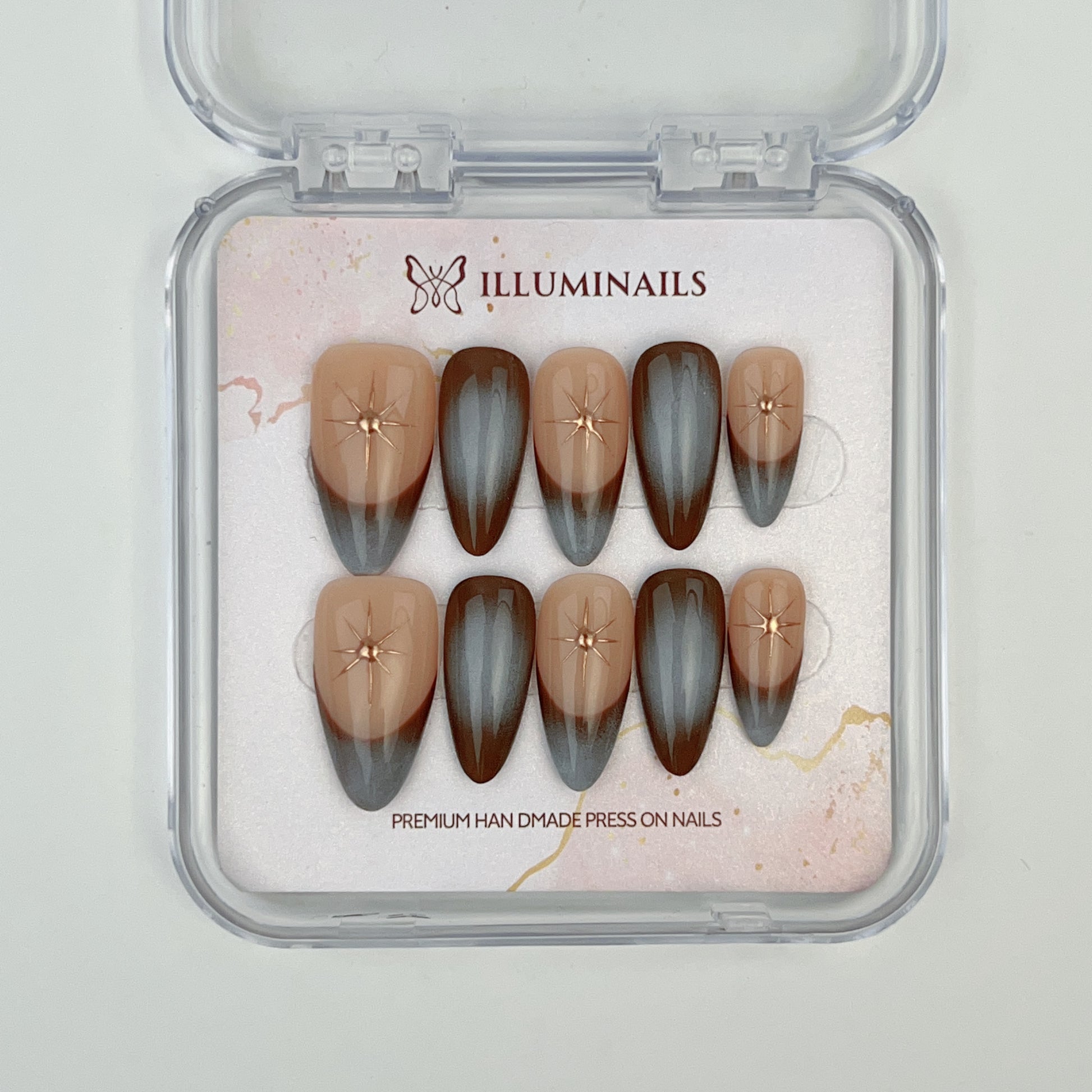 Golden Starlight blends soft nude tones with smoky blue-grey gradients, finished with delicate gold star accents that catch the light with quiet brilliance. The contrast between warm and cool shades creates depth without heaviness, offering a refined sparkle that feels modern, calm, and intentional.