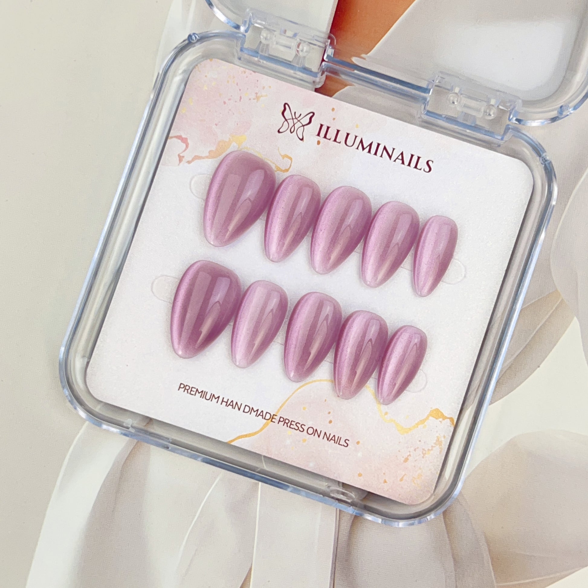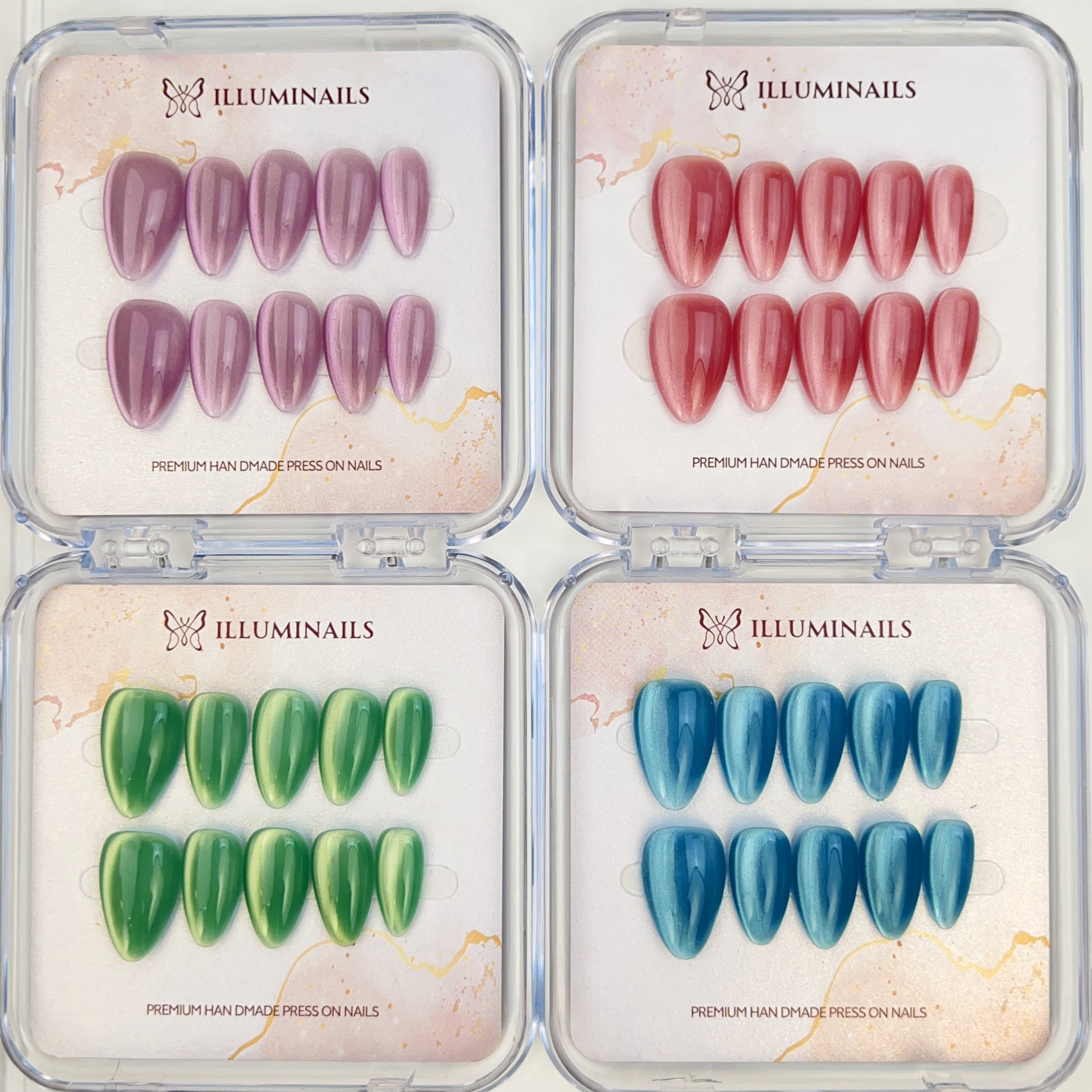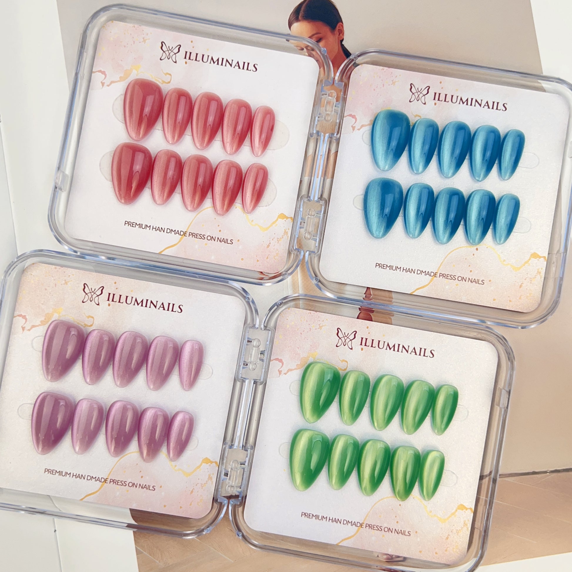 Spring Aura is a curated cat-eye press-on nail set inspired by the soft colours and gentle light of early spring. The collection features four seasonal shades — lavender, rose, green, and blue — each finished with a subtle cat-eye shimmer that moves naturally with the light.
