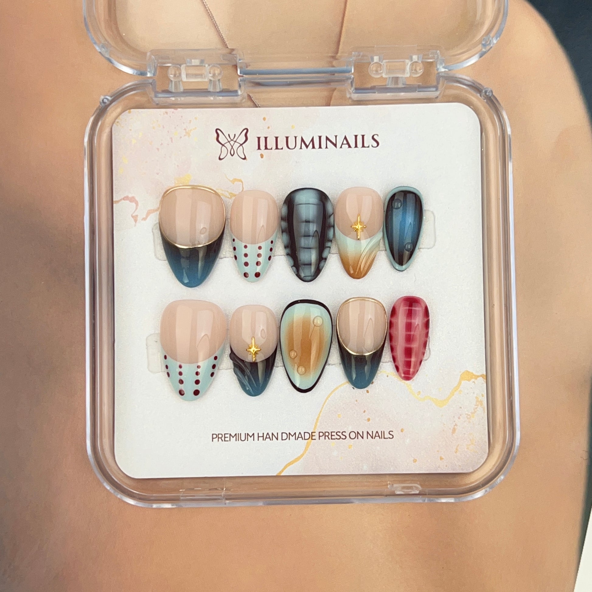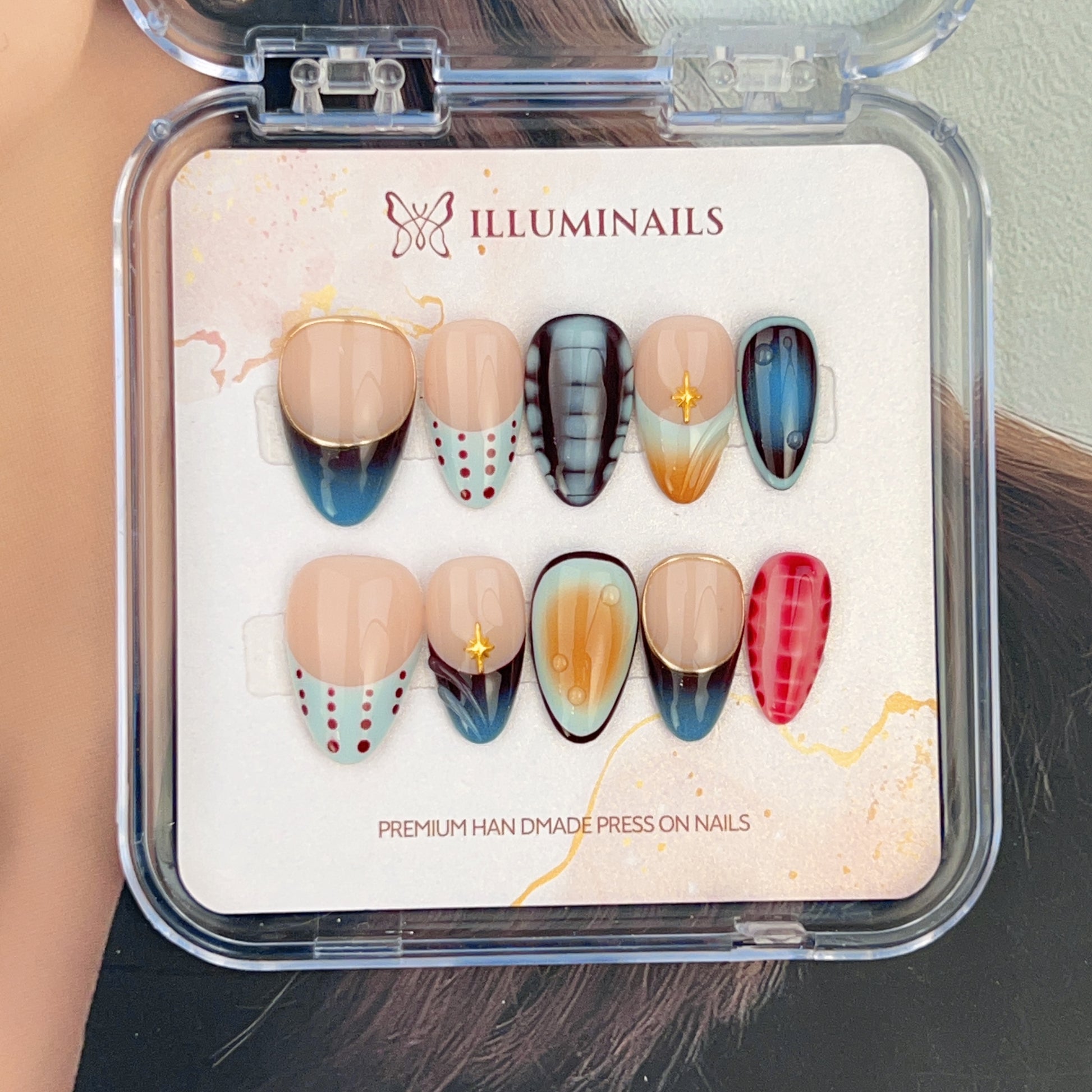 - Premium handmade press-on nails with mixed graphic and gradient designs