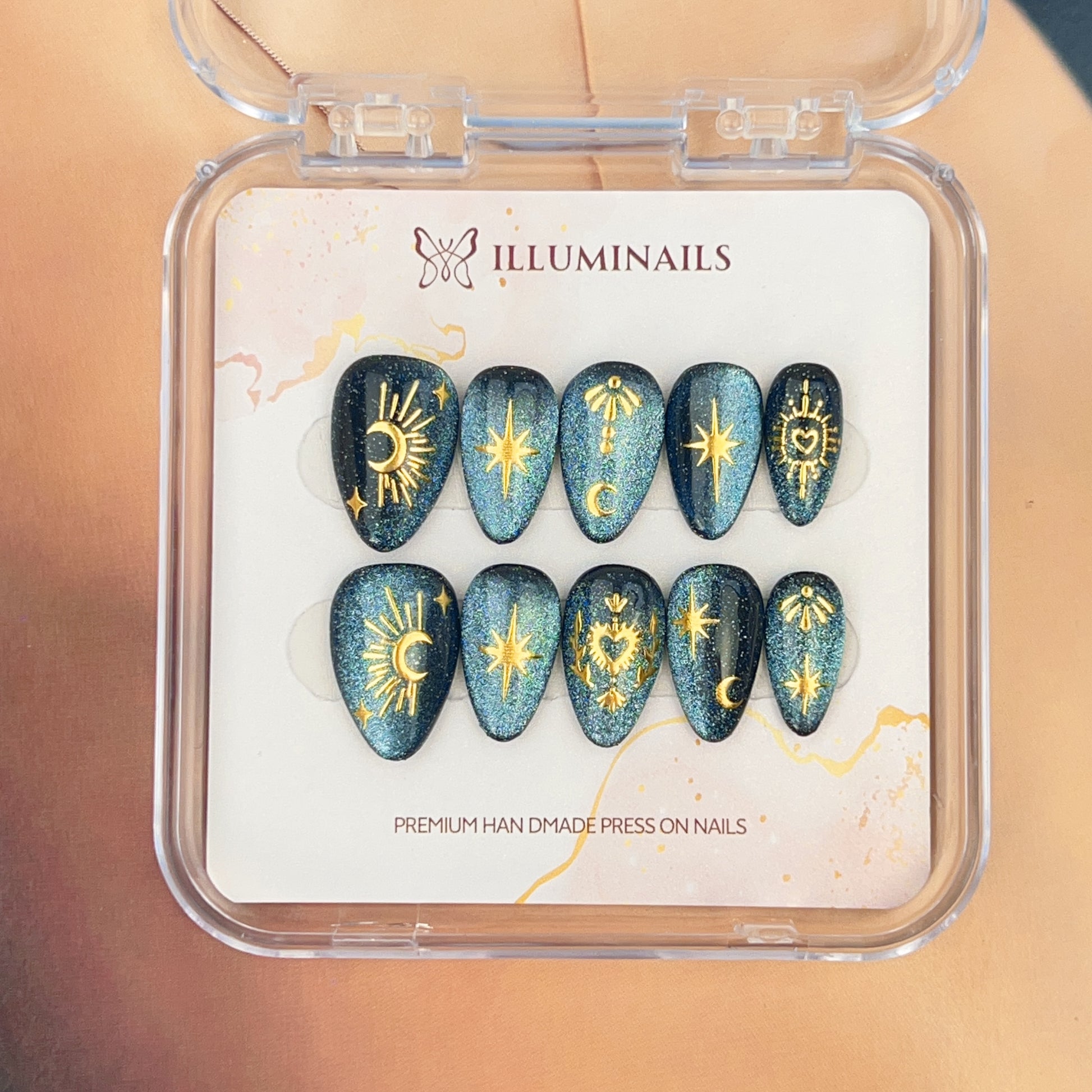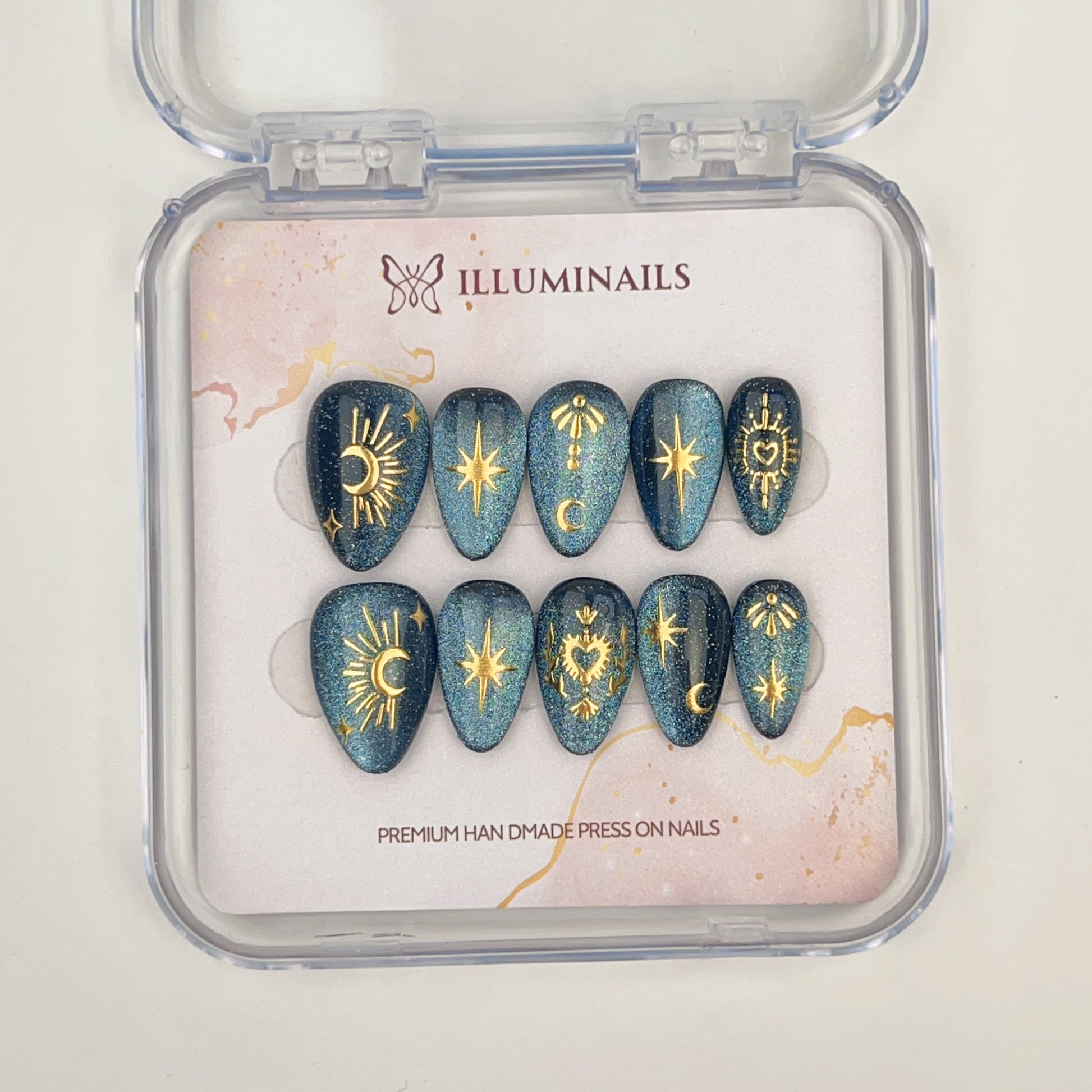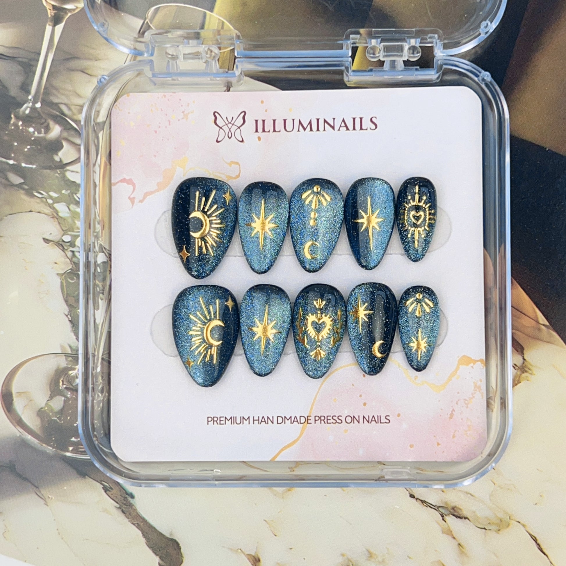 - Handcrafted press-on nails with celestial gold detailing