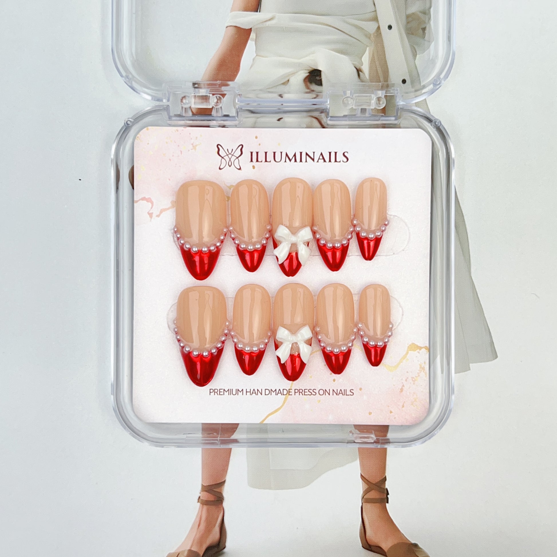 Ruby Elegance is a refined take on the classic red French tip, designed to feel polished, feminine, and quietly luxurious. A soft nude base pairs with deep ruby-red tips in a high-shine metallic finish, framed with delicate pearl detailing for a subtle touch of glamour.