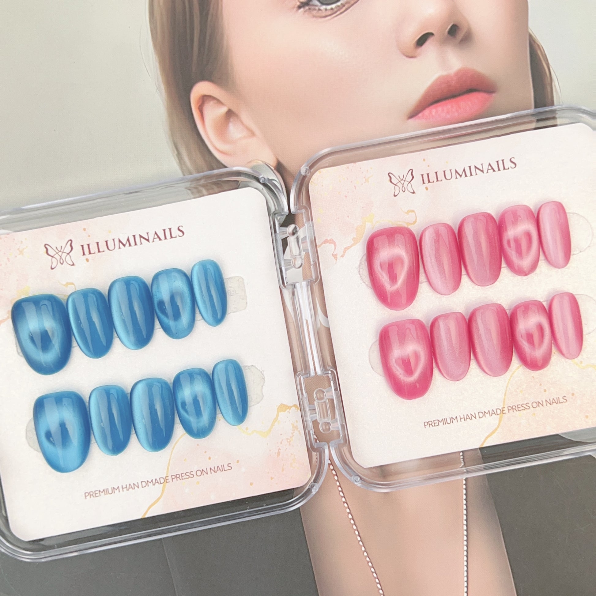 Sweetheart Beam Cat Eye features a romantic heart-shaped cat-eye glow set against vibrant blue and soft rose-pink bases.