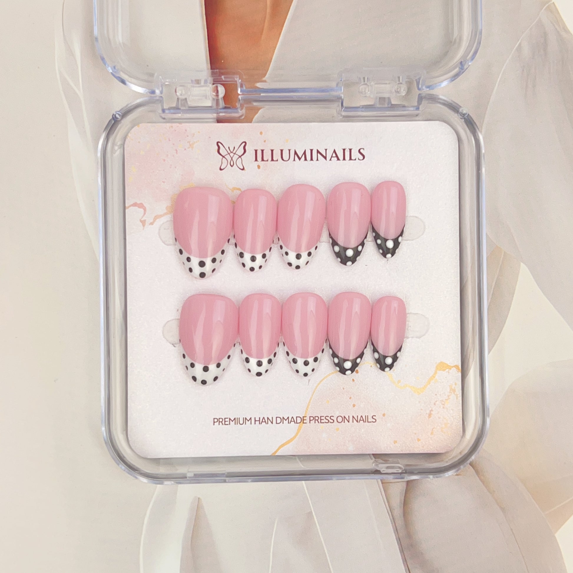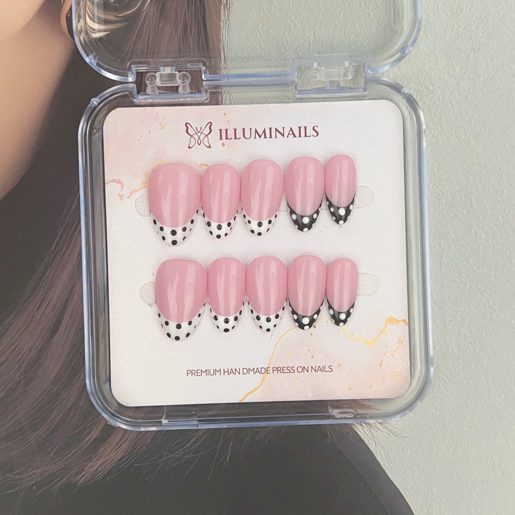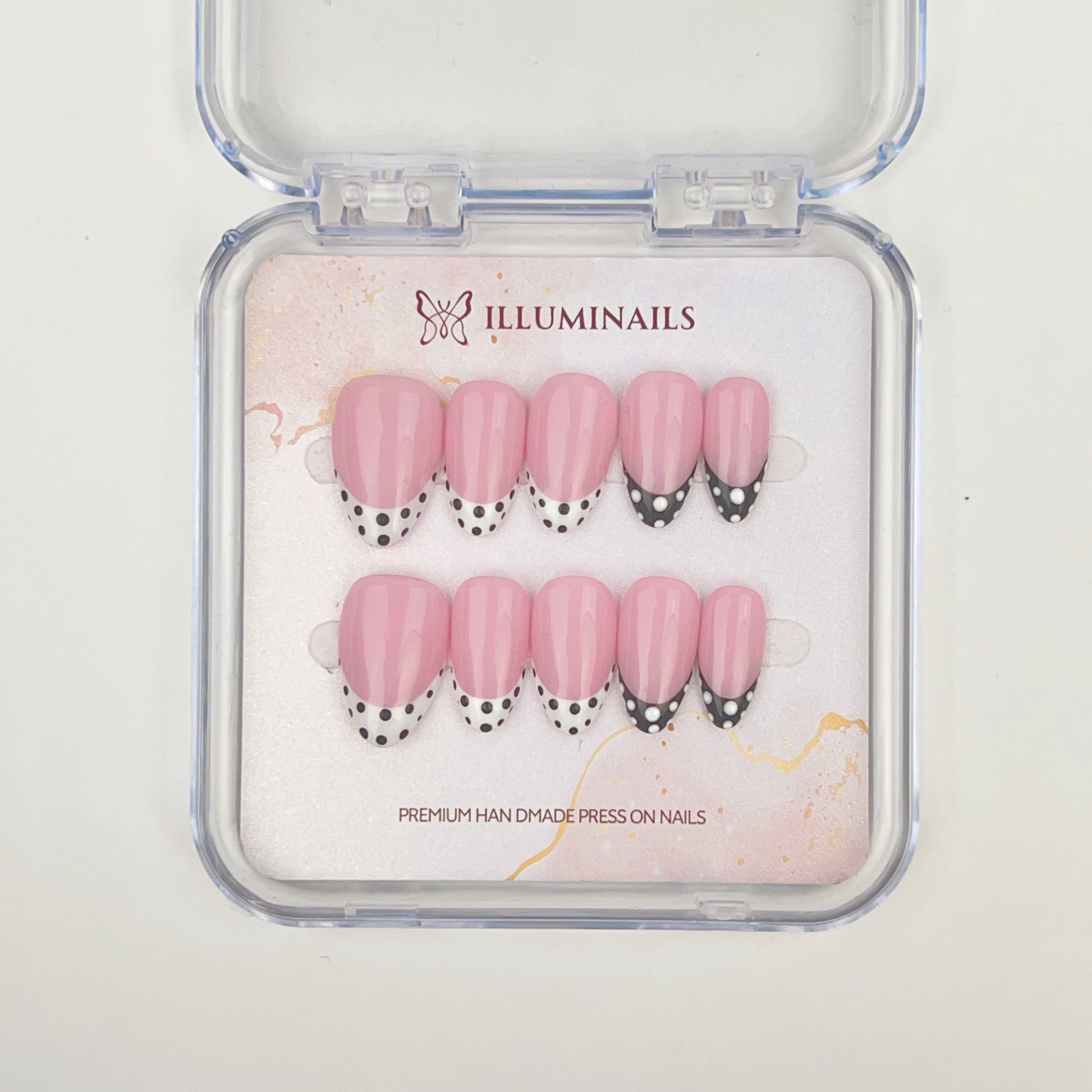 Polka French blends soft pink elegance with playful contrast—classic French tips reimagined with a chic polka-dot accent.