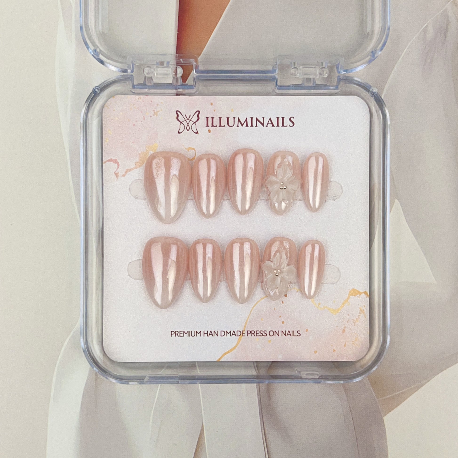 Pearl Petals is a soft blush-nude design finished with a pearlescent glaze and delicate floral accents—quietly luxurious and timeless.